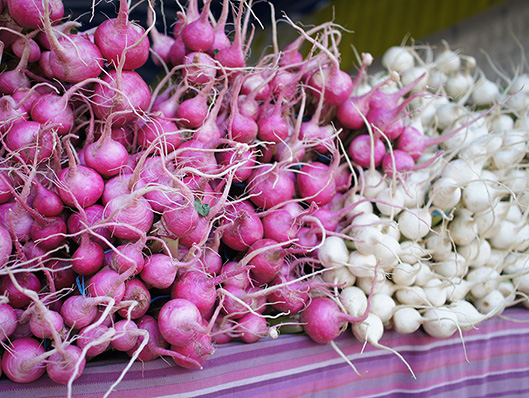 The farmers market is open three days a week-Tuesdays, Thursdays and Saturdays. On Tuesdays and Thursdays, the smaller markets occupy the front of the building along the Embarcadero; on Saturdays, the much larger market is held both in front of the Ferry Building and on the rear plaza overlooking the Bay. The markets offer fruits, vegetables, herbs, flowers, meats and eggs from small regional farmers and ranchers, many of whom are certified organic. A wealth of other products include regional artisan specialties such as breads, cheeses and jams. The Thursday market features an array of artisan street food: wood-fired pizza, grilled meats, sandwiches, and tacos, while the Saturday market also includes local restaurants serving a variety of hot, delicious meals.